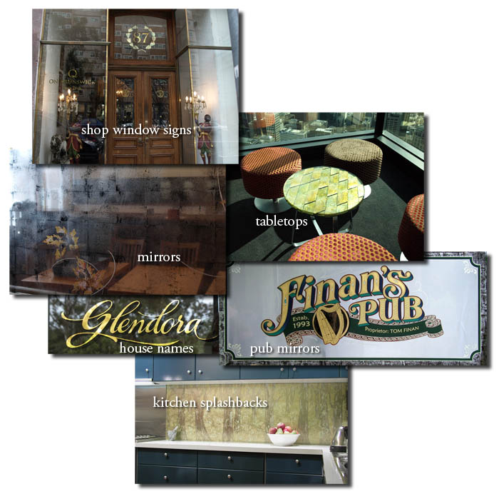 It is familiar as traditional gold leaf window signs, but is also used for a greater variety of decorative and glazing functions. The work displayed on this website are original hand-made artworks for both private and commercial clients.