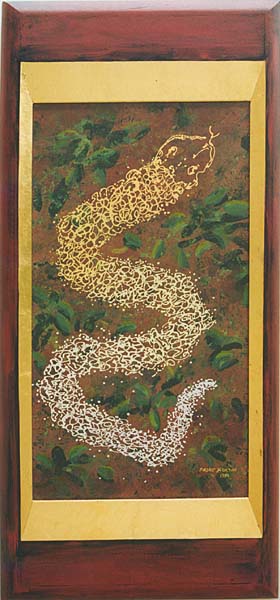 This picture of a rainbow serpent has 6 different metals, blending from red gold to silver - 23.5ct, 23ct, 18ct, 16ct, 12ct gold and silver leaf.